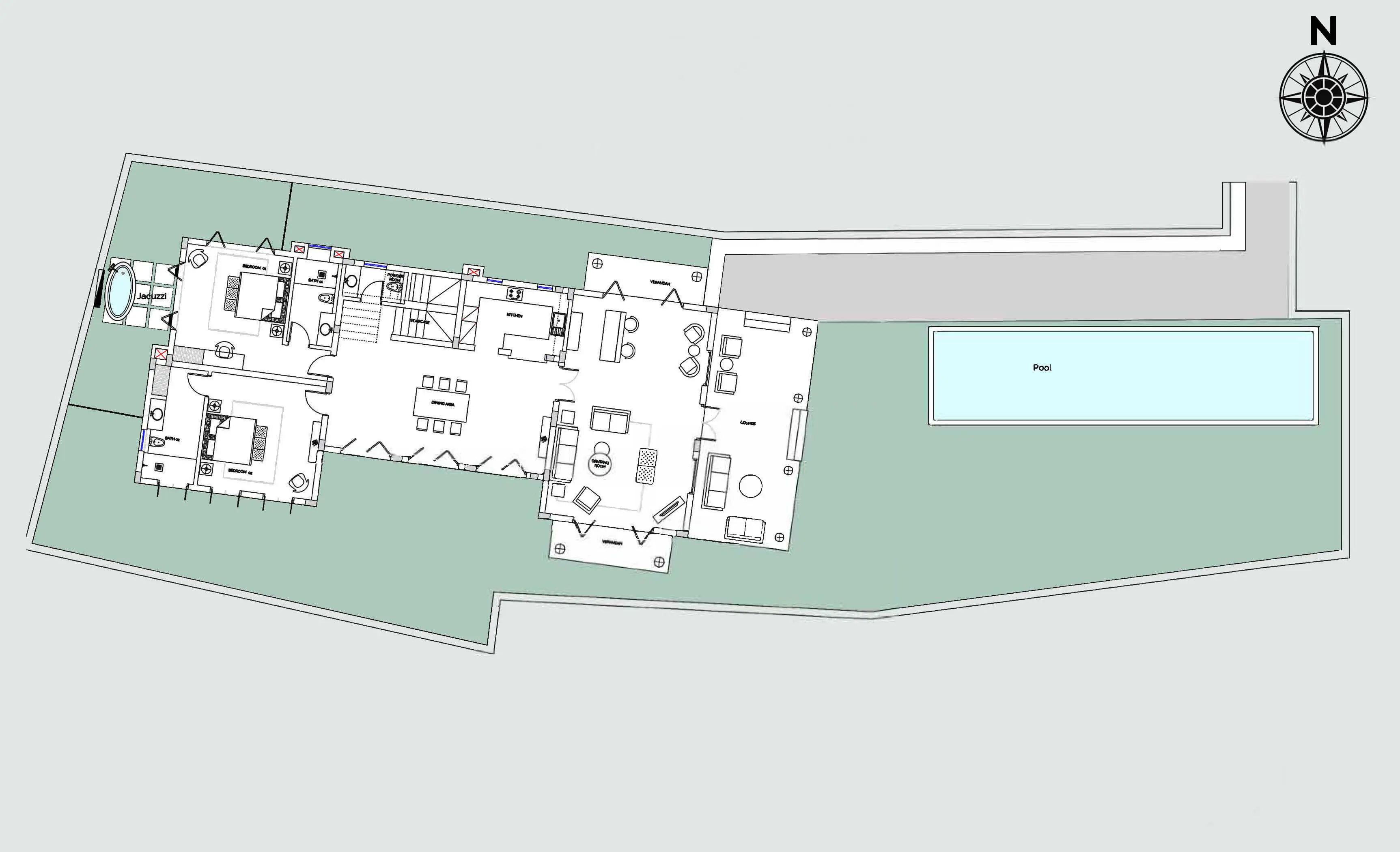 The design of Villa Da Fiore emphasises an unbroken connection with nature. The balcão at its entrance overlooks the curvy infinity pool and its adjacent gazebo, which provide an outdoor experience both open and sheltered. The central courtyard serves as a focal point, and low boundary walls enhance the feeling that the garden extends right into the surrounding fields. The jacuzzi, tucked away at the back of the house with its own lush view, adds to the perception of a fluid landscape.